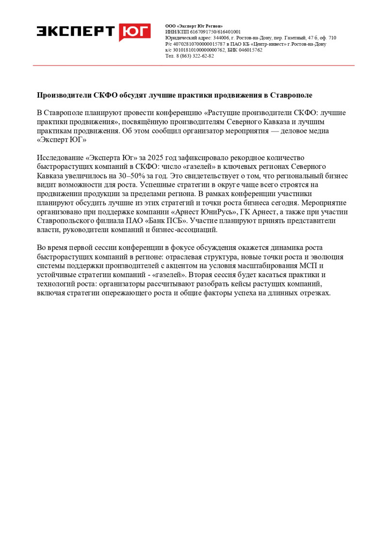 Исследование «Эксперта Юг» за 2025 год зафиксировало рекордное количество быстрорастущих компаний в СКФО: число «газелей» в ключевых регионах Северного Кавказа увеличилось на 30–50% за год. Это свидетельствует о том, что региональный бизнес видит возможности для роста. Успешные стратегии в округе чаще всего строятся на продвижении продукции за пределами региона. В рамках конференции участники планируют обсудить лучшие из этих стратегий и точки роста бизнеса сегодня. Мероприятие организовано при поддержке компании «Арнест ЮниРусь», ГК Арнест, а также при участии Ставропольского филиала ПАО «Банк ПСБ». Участие планируют принять представители власти, руководители компаний и бизнес-ассоциаций.